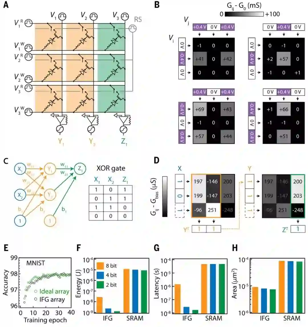 除了加速权值更新步骤外,研究人员还演示了在使用3×3 IFG阵列将’exclusive or’函数(XOR)映射到一个两层神经网络之后的推理(图C)。