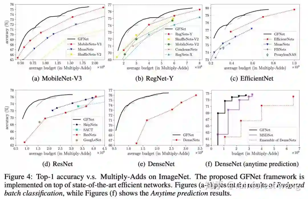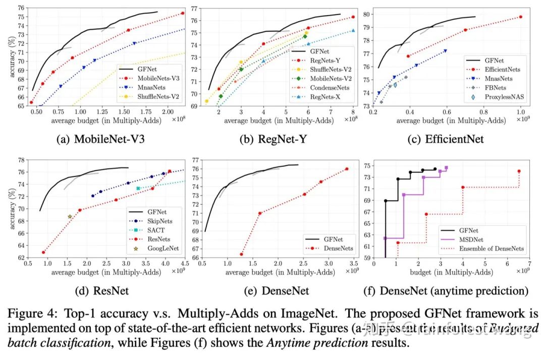 下图为我们在不同网络结构上实现GFNet的实验结果,其中横轴为网络的平均理论计算开销,纵轴为准确率,(a-e)为budgeted batch classification的结果,(f)为anytime prediction的结果。可以看出,GFNet明显地提升了包括MobileNetV3、RegNet和EfficientNet在内的最新网络结构的推理效率,同等精度下,计算开销减小达30-40%以上,对于ResNet/DenseNet的增幅可达3倍甚至更高;同等计算开销下,对MobileNetV3提点2%左右,对ResNet/DenseNet达5-10%以上。