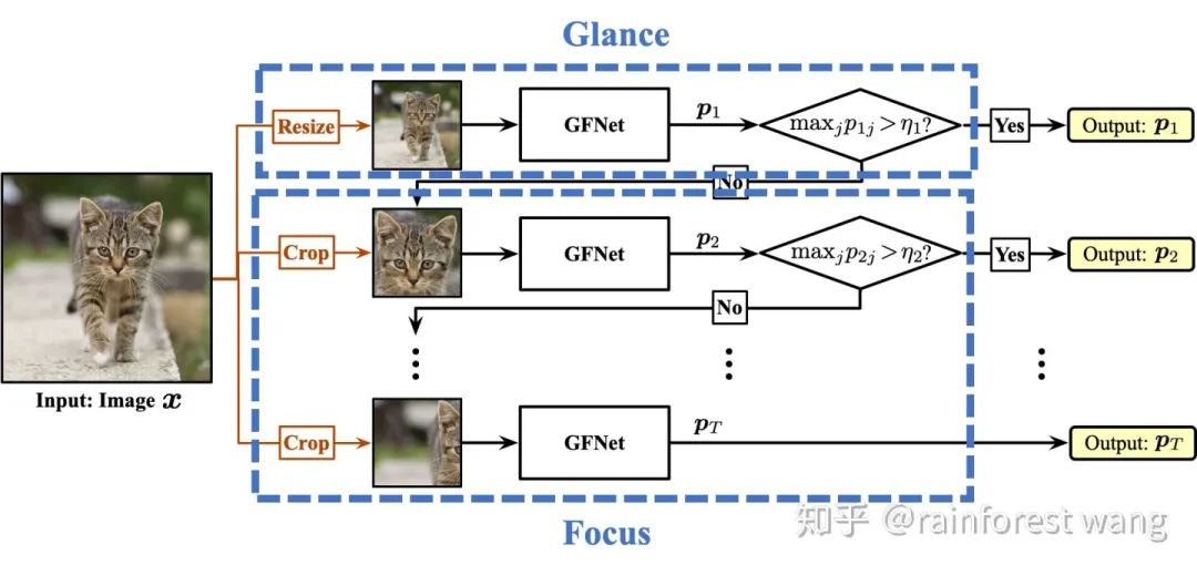 下面我们具体介绍Glance and Focus Network (GFNet) 的具体结构,如下图所示