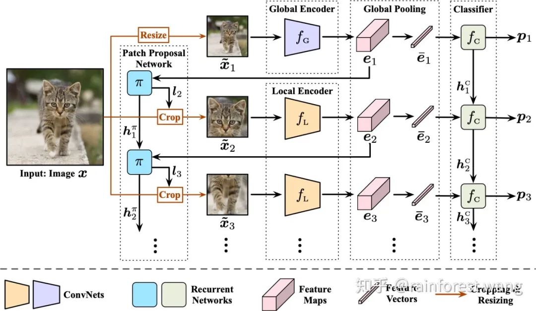 而后,我们再以这些基本的空间分布信息为基础,逐步从原图上取得高分辨率的patch,将其不断输入网络,以此逐步更新预测结果和空间分布信息,得到更为准确的判断,并逐步寻找神经网络尚未见到过的关键区域;这一阶段称为关注(Focus)。