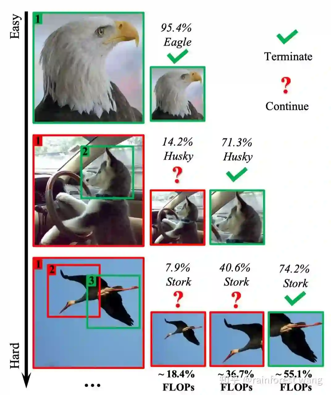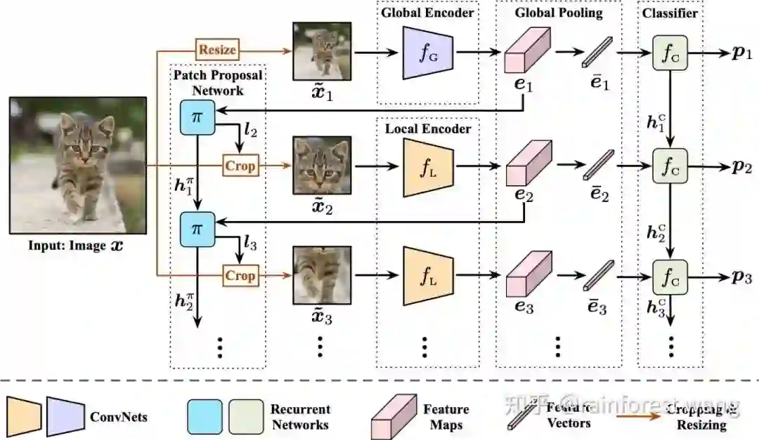 (太长不看版)下面一张图可以概括我们做的事情:将图像识别建模为序列决策过程,先将缩略图输入神经网络(Glance),再不断选择最关键的图像区域进行处理(Focus,利用强化学习实现),直至网络产生一个足够可信的预测结果时停止;对于简单和困难的样本分配不同的计算资源,以提升整体效率。