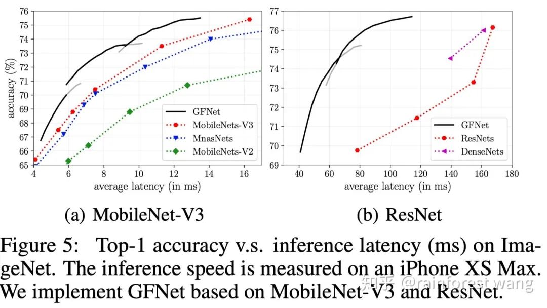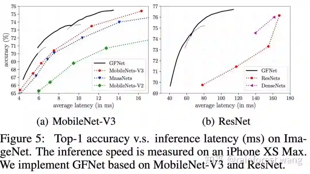 GFNet的另一个显著优势是,由于其没有更改CNN的具体结构,其可以方便地在移动端或边缘设备上使用现有的工具部署,且享有和理论结果几乎等同的实际加速比。下图为我们在一台iPhone XS Max(就是我的手机)上基于TensorFlow Lite的测试结果: