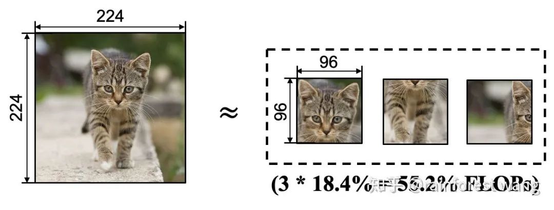 这便是本文所提出方法的出发点,我们的目标是,对于输入图片,自适应地找到其与任务最相关的区域,进而通过使神经网络只处理这些区域,以尽可能小的计算量得到可信的结果。具体而言,我们采用的方法是,将一张分辨率较高的图片表征为若干个包含其关键部分的“小块”(Patch),而后仅将这些小块输入神经网络。以下面的示意图为例,将一张224x224的图片分解为3个96x96的Patch进行处理所需的计算量仅为原图的55.2%。