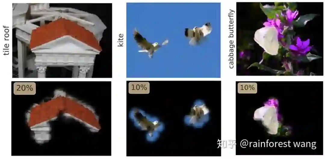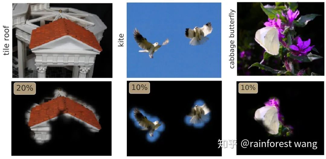事实上,我们可以借助神经网络的一个有趣的性质。与人类视觉相似,神经网络往往可以通过仅仅处理图像中与任务相关的一小部分区域而得到正确的结果,例如在下图中,遮挡住屋顶、飞鸟或花朵之外的部分,神经网络仍然可以得到正确的分类结果[6]: