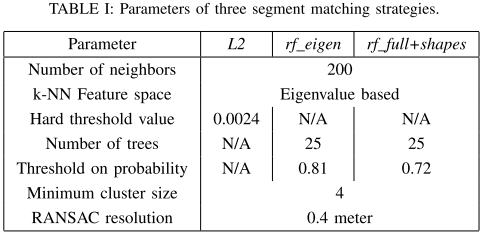 根据上述训练出的分类器,设假正例率FPR为 0.2 作为分类器的工作点。同时作者提出了一个供比较的baseline系统,该系统基于Harris 3D特征点提取,FPFH特征描述,并使用几何验证进行匹配。图5展示了没有成功定位的概率随车辆运行距离的变化。RF_eigen+shapes方法总是能够在55米内成功定位,而L2方法则需要67米,RF_eigen需要88米。对于L2方法,虽然速度最快,但是造成了14次错误的定位;而基于随机森林的两种方法在35米内定位成功的概率为95%。