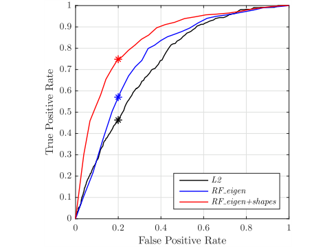 为了验证片段匹配方法的优劣,作者将本文提出的算法(RF_eigen+shapes)与基于欧氏距离阈值的算法(L2)和仅基于特征值特征的随机森林算法(RF_eigen)进行了对比,各算法的参数见下表,图3展示了ROC曲线,图4为示例的正确匹配的片段。