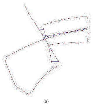 首先使用ICP算法来给相邻的激光雷达帧间添加约束,并且建立全局地图,这必然会导致漂移,如图6(a)所示,其中红点表示分割和回环检测的执行地点,蓝线表示检测到的回环,没有误检测。(b)图展示了添加回环约束,经过位姿图优化之后的地图。
