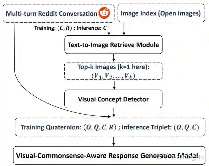 Maria 由三个组件组成:图像检索模型、视觉概念检测模型和基于视觉知识的对话生成模型。图像检索模型负责根据对话的上下文检索出可视化世界体验,例如,从图像数据库中检索出与对话相关的图像。图3是Maria框架的流程图。