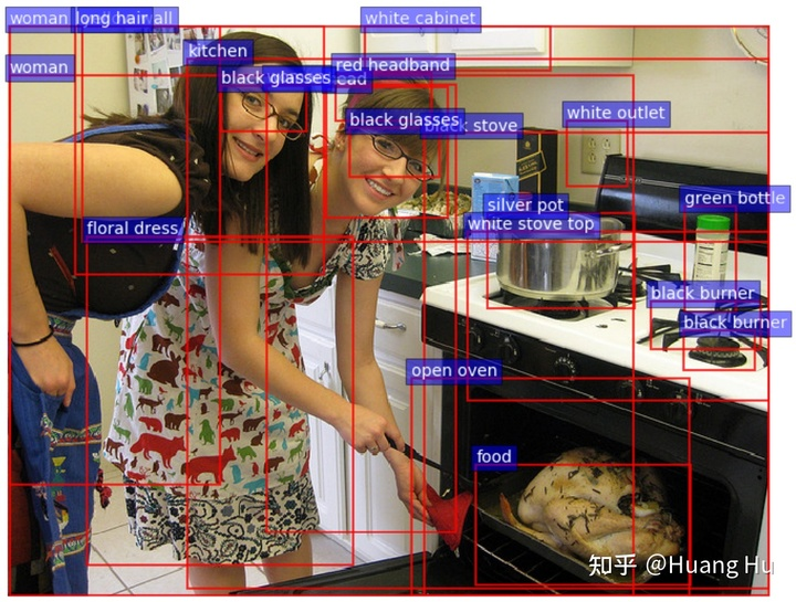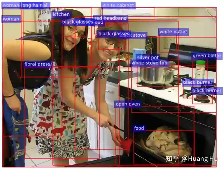 给Reddit语料中的每个对话匹配了一个最相关的图片之后,视觉概念检测模型,即为UpDown [7] 在 Visual Genome [8] 数据集上预训练的物体检测器,从检索出来的图片中提取图像的区域特征(bboxes)和相应的视觉概念标签(object tags),比如图5中显示的蓝色标签:kitchen, black glasses, open oven 等。