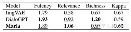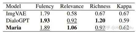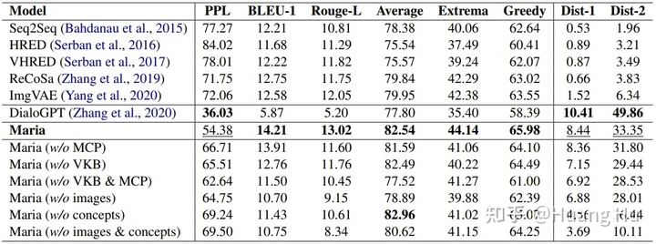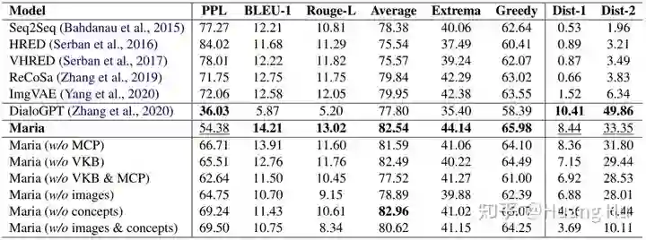 在表1的主实验中,本文比较了 Seq2Seq、HRED、VHRED、ReCoSa、ImgVAE,以及 DialoGPT 这些基线模型。可以看到,除了 DialoGPT 外,Maria 生成的回复质量在流程度(PPL)、相关性(BLEU/Rouge-L/Average/Extrema/Greedy)以及多样性(Dist-1/2)上都要显著优于基线模型。尤其是,与最新的 SOTA 模型 ImgVAE 的比较中,Maria 的 Dist-1/2 要显著优于 ImgVAE。这表明引入从图像中抽取的视觉知识,有助于生成多样性更好、信息度更丰富的回复。这与表2中的人工评估结果也是一致的,Maria 的内容丰富度要比 ImgVAE 明显好。另一方面,ImgVAE 中文本到图像的生成模型是在 ImageChat [13] 上训练,在Reddit对话数据上进行测试的。训练集和测试集数据分布的差异,导致 ImgVAE 实际中的效果并不理想。另外一个观测结果是,Maria 在 PPL 和 Dist-1/2 指标上的表现要略逊于 DialoGPT。原因是,DialoGPT 是一个大规模预训练的对话模型,并且引入了额外的反向模型来提高生成回复的多样性。