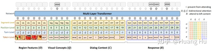 在 中的 self-attention mask 是自左向右的,其它的segment是双向的。也就是说 中的tokens 可以 attend 中所有的token,以及 中左边的 token,这么设计是为了鼓励模型在生成回复的时候,去学习所有输入 token(包括视觉模态和文本模态)之间的对应关系。