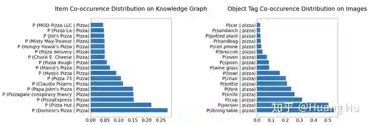 受此启发,本文选取了一个常见单词“pizza”,并收集了在 Google 知识图谱 [3] 和 MS-COCO [4] 图像数据上与“pizza”共现次数最多的 17 个词。如图2所示,知识图谱上与“pizza”共现的词往往是一些抽象概念,比如“Pizza Hut”(必胜客),而图像数据中物体标签的共现关系反映了我们现实世界的一些常识,例如“pizza”通常在“餐桌”上,人们在吃“pizza”时通常使用“刀”。有趣的是,我们还发现“pizza”也与“手机”甚至“植物”也经常共同出现。这说明人们在吃“pizza”时,有时会把“手机”放在桌子上,或者餐厅里可能摆放了一些“植物”。更多例子参见论文附录。