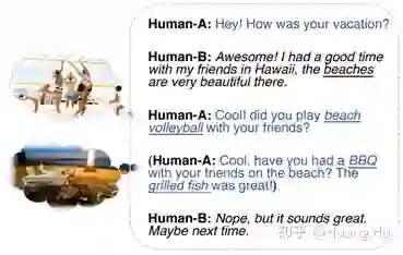 尽管最近在纯文本语料库上训练的大规模对话模型,如 Meena、Blender 和 DialoGPT 已经展现出了惊艳的表现。但它们在学习过程中,仍然缺乏对现实世界的视觉感知能力。最近,Bisk等人发表在 EMNLP 2020 上的一项研究工作 [1] 指出,共同的世界体验是让语言交流真正有意义的关键所在。另一项先前的研究 [2] 也表明,视觉感知是一种丰富的信号,可以用于建模仅仅通过文本无法记录的世界体验。图1展示了一个对话的例子,当人类 B 在谈论夏威夷海滩的假期时,人类 A 联想到了过去自己在沙滩上打排球或烧烤的经历。然而,沙滩和排球(或烧烤)之间的关联关系在传统知识库中(例如,知识图谱)却很难捕捉到。