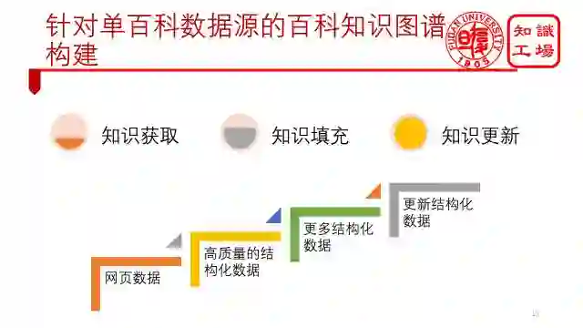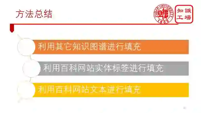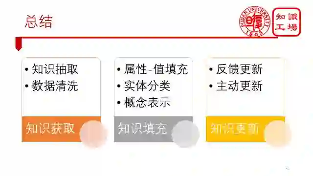 最后,总结下来。针对单数据源百科知识图谱构建的方法就是分为这样三个步骤,先通过知识获取,将网页数据转化为高质量的结构化数据,再通过知识填充,得到更多结构化的知识,最后通过知识更新,保证你的知识永远是最新的。