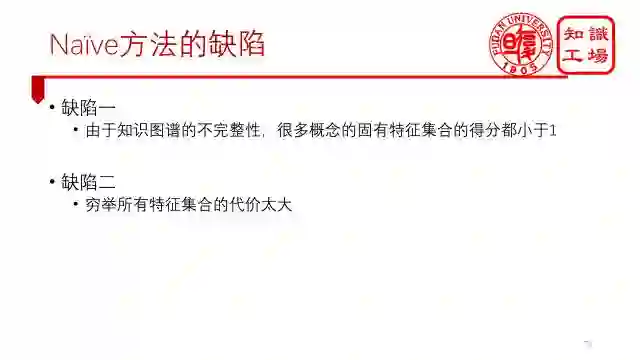 当然,这种方法是有缺陷的。首先,由于知识图谱的不完整性,很多概念的固有特征集合的得分都小于1,这些就会漏掉很多概念的固有特征集合。其次,穷举所有特征集合的代价太大了。