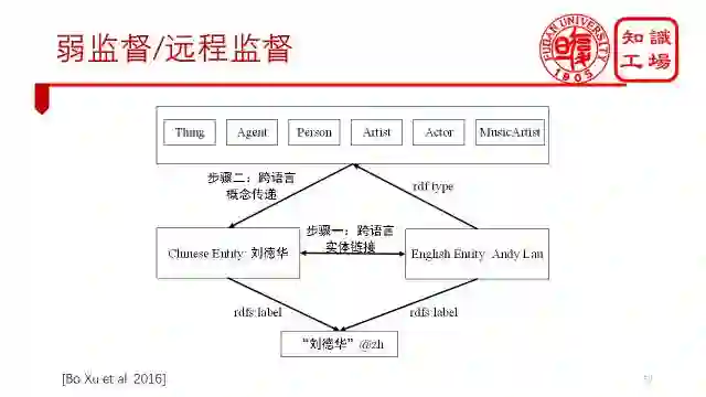 更多情况下,我们遇到的问题是没有训练集,例如,我们要将百度百科的实体分类到英文DBpedia的本体上去。所以我们可以通过一种被称为弱监督或者远程监督的方法来构建训练集,即首先建立起中文百度百科实体和英文DBpedia实体的等价关系,再把英文实体的分类关系传递给等价的中文实体,通过这种方式就能为一些中文百度百科实体获得标记数据了。