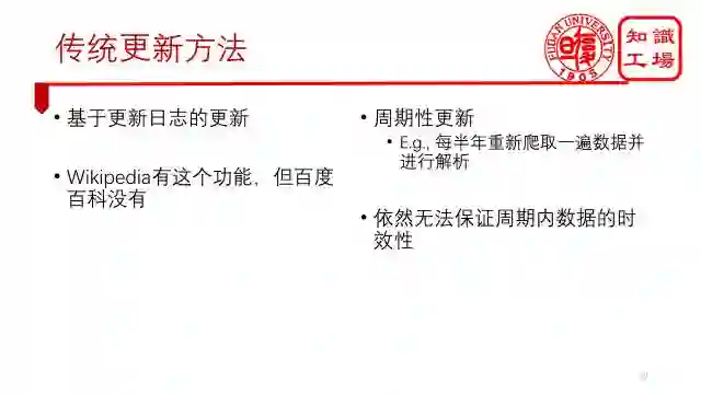第二种方法是周期性更新,即每隔一段时间,比如说半年重新爬取一遍数据,并进行解析。且不说这种方法代价巨大,时效性同样不能保证。有些知识可能在刚爬取完就更新了,那么它也只能等待下一个更新周期了再更新了。