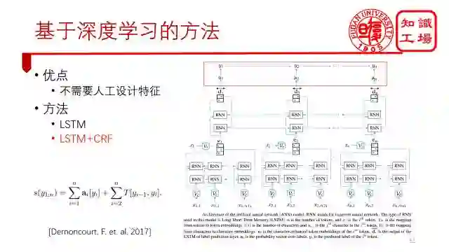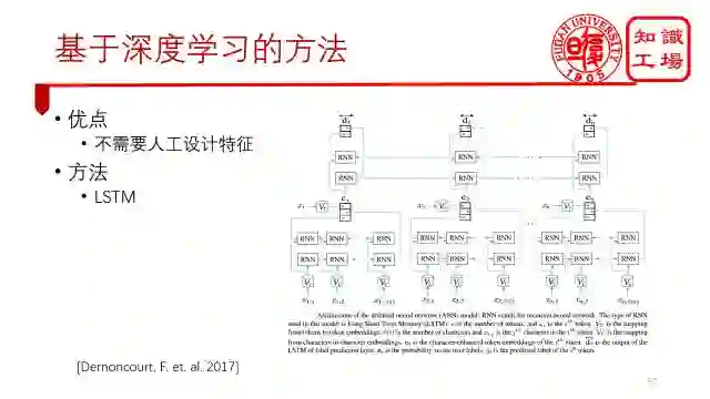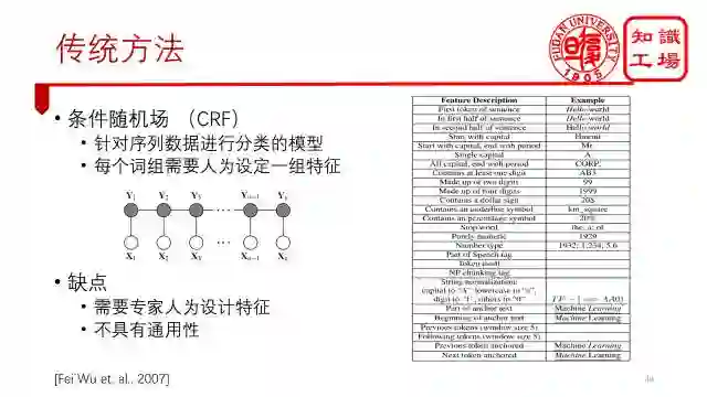 传统最好的方法是使用条件随机场来进行序列数据标记。它同时考虑了每个单词的特征以及句子的顺序性,但缺点是需要专家人为设计一套特征,如下图右边所示,特征选择的好坏直接影响分类的结果。同时,也不具有通用性,英文的需要设计一套特征,换成中文的话,又要设计另外一套特征了。