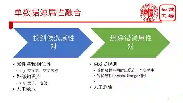 一般来讲,分为两步,第一步是找到候选属性对。可以通过属性相似性来找候选属性对,这样英文名和英文名称就能找到了。但是有一些属性对还是找不到,比如妻子和老婆。这个就需要利用外部的同义词知识库来做了。大家可以从同义词字典、百度汉语等地方来找同义词。如果还有些找不到的话,就要通过人工的方式录入进去。第二步是删除错误的候选属性对。那么如何删除错误属性对呢?一般来说,是基于启发式规则来做的,包括等价属性不能同时出现在一个实体中。例如复旦大学这个实体中不可能同时出现“英文名”和“英文名称”这两个属性。以及等价属性的domain和range要相同等等。最后,再通过人工的方式删掉一些。