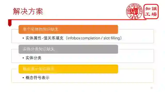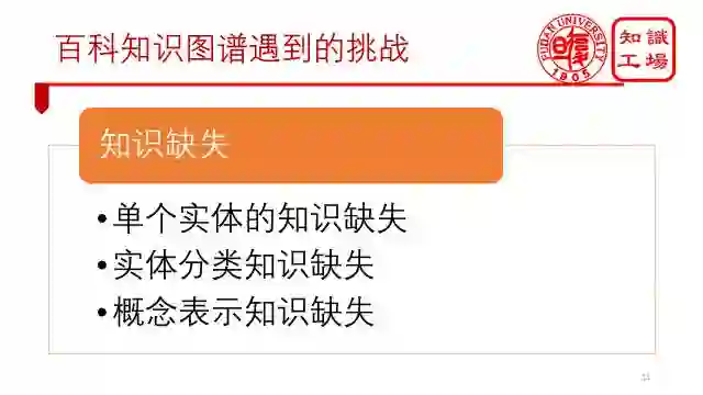 所有百科知识图谱都会面临的一个不可避免的问题就是知识缺失。因为我们的数据源是百科类网站,而它们很难做到完整。总体来说,包括三类知识缺失: