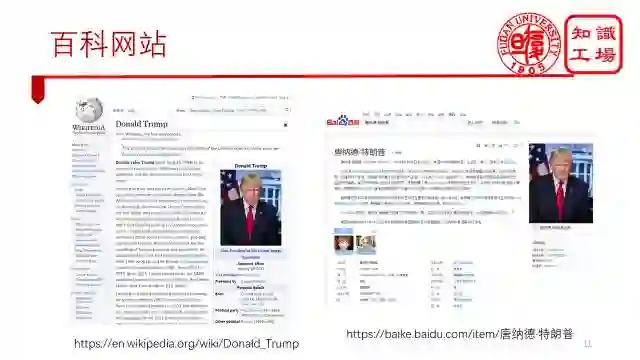 当然,不同百科网站能得到的知识也不尽相同。Wikipedia中就有一些百度百科中没有的知识,比如说概念的层次结构、实体的地理信息以及实体的多语言版本等。
