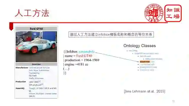 人工方法的典型代表就是DBpedia,它通过众包的方式构建了一个本体ontology,然后又通过众包的方式建立起了Wikipedia infobox模板名称和ontology中概念的等价关系。这样的话,一个实体就能根据它的模板名称来判断它属于哪些概念了。