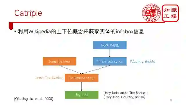 Catriple利用了Wikipedia的上下位概念来获取实体的infobox信息。如下图所示,根据(Songs by artist, The Beatles songs)能推断出任何属于概念TheBeatles songs的实体都包含(artist,The Beatles)这一对属性-值对。根据(Rock songs ,British rock songs )能推断出任何属于概念Britishrock songs的实体都包含(Country,British)这一对属性-值对。因此,实体Hey Jude能得到两组infobox,分别是(Hey Jude, artist, The Beatles)和( HeyJude, Country, British)。