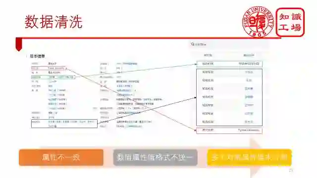 三类数据清洗的例子如图所示。根据属性融合方法,我们将“英文名”改成了“英文名称”。根据数值属性归一化方法,我们将“1905年(乙巳年)9月14日”统一成“1905年09月14日”。根据对象属性值分割方法,我们将复旦大学的知名校友给分割开来。