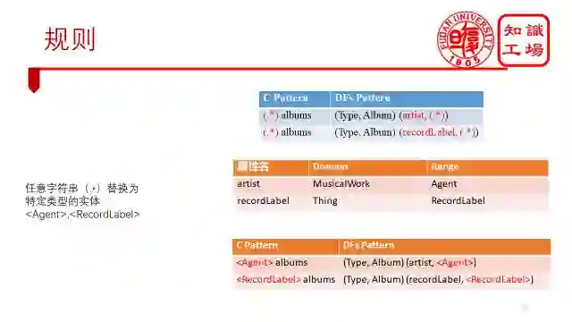 当我们将这个任意字符串(.*)限定为特定类型的实体<Agent>,<RecordLabel>时,我们发现,这样总结出来的规则就能很好的匹配上诉的例子了。具体如何对任意字符串进行限定了,我们可以根据属性的值域range来进行限定。