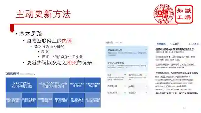 所以我们又提出了一个主动的自动更新方法。基本思路是监控互联网上的热词。热词分为两种情况,一种是新词,另一种是旧词,但信息发生了变化,这刚好满足我们的更新旧词以及增加新词的更新策略,然后,更新热词以及与之相关的词条。