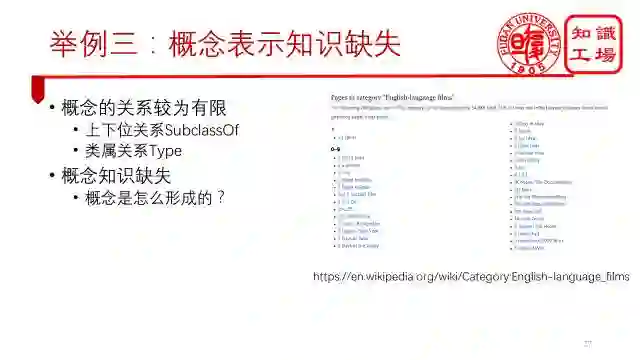 第三个是概念表示知识缺失。相对于实体而言,我们对概念的认识还不够,目前只知道一个概念的父概念是哪个,子概念是哪个,以及它包含哪些实体,但我们无法直接从知识图谱中获知这个概念是怎么形成的?