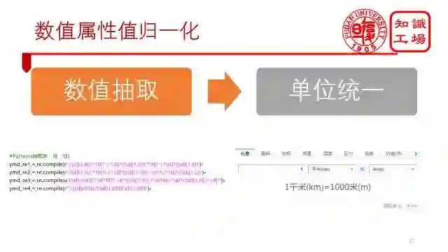 之所以要对数值属性归一化,是因为数值属性的属性值往往是由数字+ 单位构成。所以可以分为数值抽取和单位统一两个步骤,比如通过正则表达式抽取出年、月、日等数值信息,通过转化公式来统一单位。