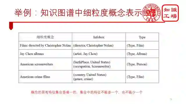 这样的话,我们就能利用知识图谱中实体的infobox和Type信息来表示实体的细粒度概念(标签),上图表中给出了四个例子。当然,需要注意的是,概念的固有特征集合是唯一的,集合中的特征不能多一个,也不能少一个。