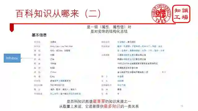 接下来就是infobox信息,又叫基本信息框,是一组(属性,属性值)对,是对实体的结构化总结。很多情况下,你可以不看内容,只看infobox信息就能了解这个实体了。Infobox是百科知识图谱最重要的知识来源之一,从关系数量来说,它也能提供最多知识的一类关系。