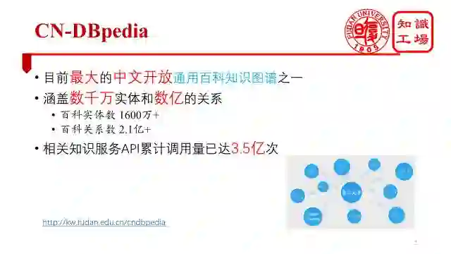在正式介绍之前,我先简单介绍一下我们知识工场实验室目前在百科知识图谱构建方面的工作。我们构建的知识图谱叫做CN-DBpedia,从这名字大家也能看得出来,是一个类似于DBpedia的工作,主要以百度百科作为单数据源进行知识图谱构建。目前,CN-DBpedia已经成为最大的中文开放通用百科知识图谱之一,涵盖数千万实体和数亿的关系。API累计调用量已经超过了3.5亿次。
