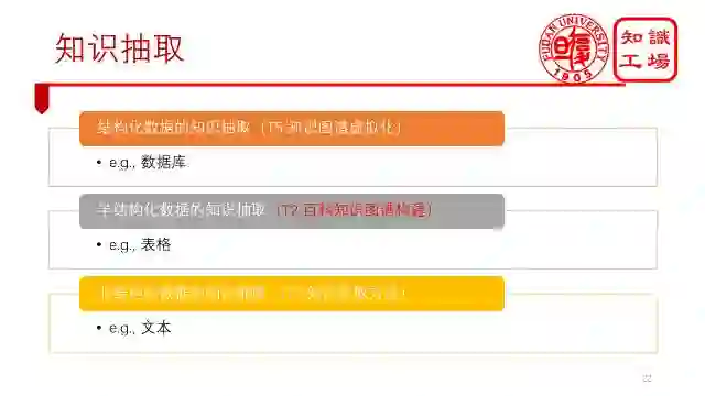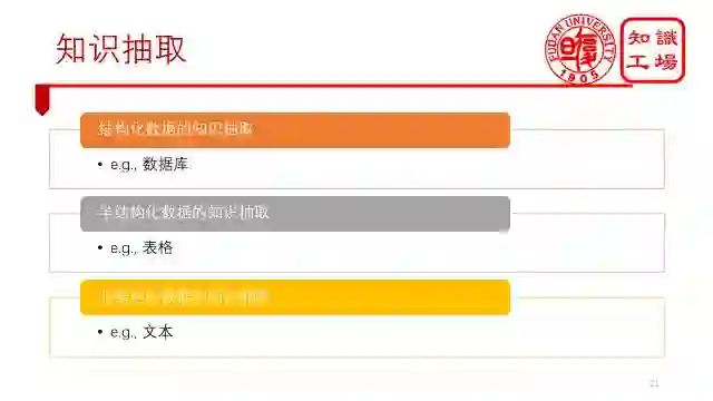 知识抽取大致能分为三类,一类是结构化数据知识抽取,比如说从数据库里面抽取知识。另一类是半结构化知识数据抽取,比如说从表格里面抽取知识。第三类是非结构化知识数据抽取,比如说从文本里面抽取知识。