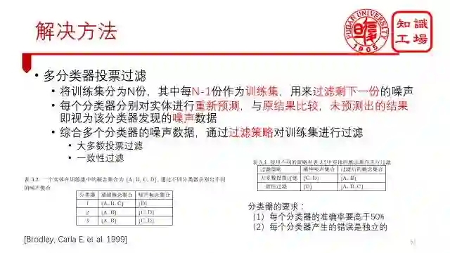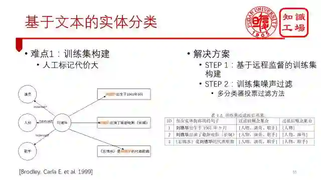 针对这个难点我们都采用远程监督的方法,把知识图谱中实体的分类结果赋给句子中的mention,这里需要注意的是,远程监督方法能够实现的原因是我们通过上一步基于语义关系特征已经得到了大量实体的分类。没有上一步的话,这一步也做不出来。同样的,基于远程监督的方法会产生很多的噪声,因此我们又需要通过多分类器过滤的方法对训练集进行过滤。