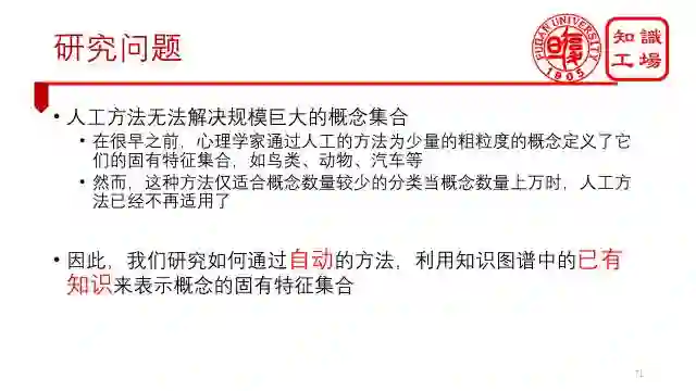 在很早之前,心理学家就通过人工的方法为少量的粗粒度的概念定义了它们的固有特征集合,如鸟类、动物、汽车等。然而,这种方法仅适用于概念数量较少的分类,当概念数量上万时,人工方法已经不再适用。因此,我们研究的是,在有了知识图谱之后,如何通过自动的方法,利用知识图谱中的已有知识来表示概念的固有特征集合。