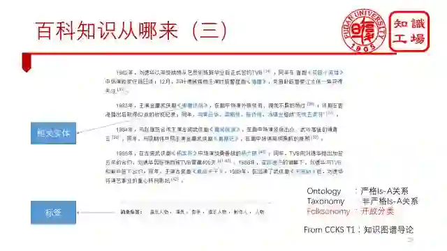 还有就是相关实体关系, 如下图中蓝色字体部分,代表着一个与当前实体有联系的其他实体。另外就是标签了。根据“知识图谱导论”课程上说的,知识体系分为三类。第一类是ontology,不同层节点之间是严格的IsA关系,可以适用于知识的推理。第二类是Taxonomy,上下位节点之间是非严格的IsA关系,可以表示概念的二义性。第三类是Folksonomy,能够涵盖更多的概念,但难以进行标签管理。