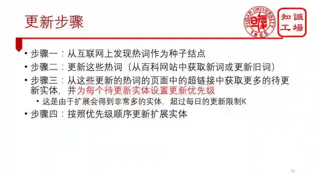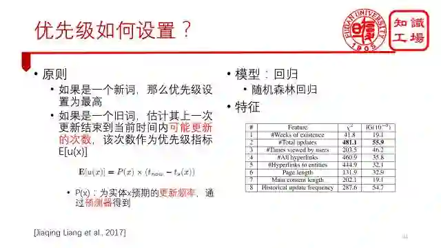 所以,整个更新框架就是这样,先发现热词作为种子结点,更新这个热词,再从热词的页面中,扩展得到更新的实体。重点是,到了这一步并不是马上更新这些实体,因为一扩展实体的量就上来了,我们根本更新不了这么多的实体,并且并不是每个实体都发生了变化,所以我们对每个扩展实体设置了一个更新优先级,然后根据这个优先级来进行更新。
