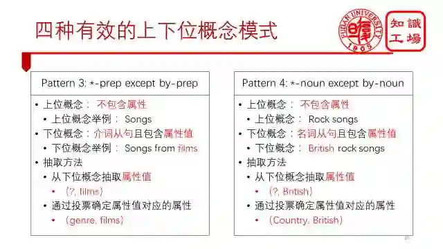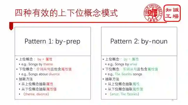 第一种为by-prep的上下位概念组合。其中上位概念需要满足“by +属性”这一条件,例如songs by theme。下位概念需要满足“是介词从句且包含属性值”这一条件,例如Songs about divorce。如果满足这两个条件,那么就可以从上位概念中抽取属性,从下位概念中抽取属性值。这一属性-值对将传递给下位概念的所有实体。