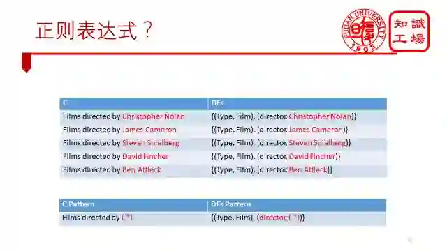 基于规则的方法首先是要找规律。我们先来看看这个例子,表中我们已经找到了5个概念的固有特征集合,我们发现,它的规律非常明显,只有红色标记的位置发生了变化,其他部分都是一样的,所以我们第一个猜测就是能不能利用正则表达式来表示一个规则,比如第二张表这样的形式。