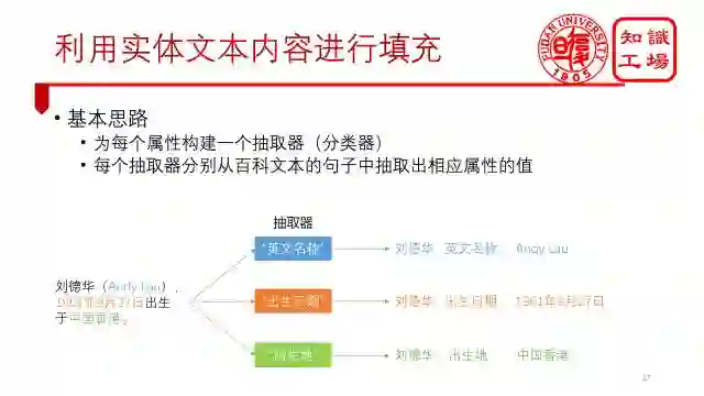 第三类进行infobox completion的方法是利用实体的文本内容进行填充。对实体正文进行属性值抽取和之前的网页抽取器类似,可以看作是为每个属性分别构建一个抽取器,例如“刘德华(AndyLau),1961年9月27日出生于中国香港。”这个句子,通过“英文名称”抽取器可以得到AndyLau这个属性值,出生日期抽取器可以得到1961年9月27日,而出生地抽取器可以得到中国香港这个属性值。