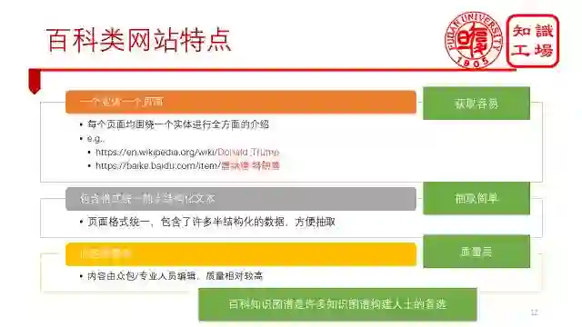 接下来,我将以CN-DBpedia为例,介绍如何对单百科数据源进行深度抽取。后面我们讲的百科知识图谱构建均表示对单百科数据源进行深度抽取的构建方法。总的来说,百科知识图谱构建分为三个部分,第一个是知识获取,就是通过自动的方法将网页数据转化为高质量的结构化数据。第二个是知识填充,即在现有数据的基础上加以完善,得到更多结构化的知识。第三个是知识更新,就是保证你所获得的知识永远是最新的。
