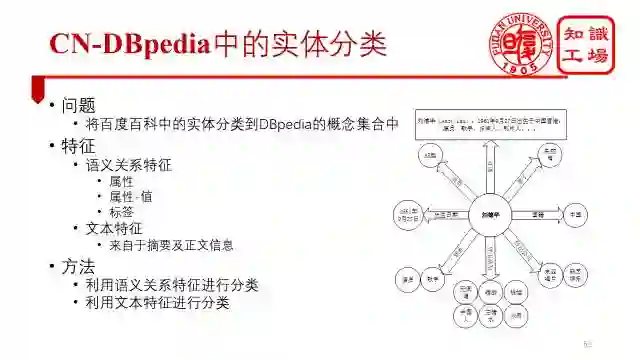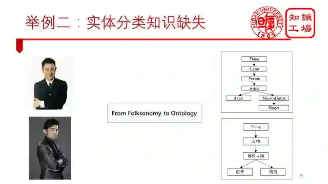 第二个是实体的分类信息缺失。我们知道,百度百科中的标签属于folksonomy开放标签,无法进行推理,因此,我们需要把实体分类到能进行推理的ontology上去。
