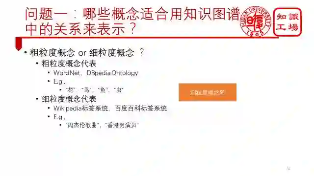 在这之前,我们需要回答两个问题。第一个是哪些概念适合用知识图谱中的关系来表示?概念包括粗粒度概念和细粒度概念。粗粒度概念有“花”,“鸟”,“鱼”,“虫”等,细粒度概念有“周杰伦歌曲”,“香港男演员”等。