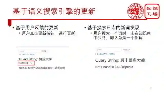 第一种是之前提到的我们构建了一个语义搜索平台,用户可以通过输入关键字来得到结构化的结果。如果用户觉得这条知识过时了,百度百科上有新的,那么点击更新按钮,我们就会从百度百科上去拿新的内容过来。