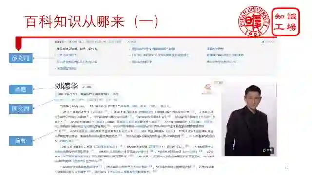 由于百科网站一个实体只占据一个页面,所以实体的所有关系也只能从这么一个网页上获得。有句话叫所见即所得,我们把一个页面从上翻到下,看到什么,就拿什么。一般来说,百科知识可以分为这么几大类,首先是标题,用来表示实体名称。然后是它的同义词和多义词以及摘要关系。