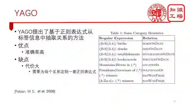 具体来说,YAGO是使用了一种基于正则表达式的方法来从标签信息中抽取关系。例如,通过正则表达式([0-9]{3,4}) births 来抽取BornOnDate关系,或者通过Mountains|Rivers in (.*)来获取LocatedIn关系。这种方法的优点是准确率高,每类关系的准确率都超过90%。但缺点是代价太大了,需要为每个关系定制一套正则表达式。