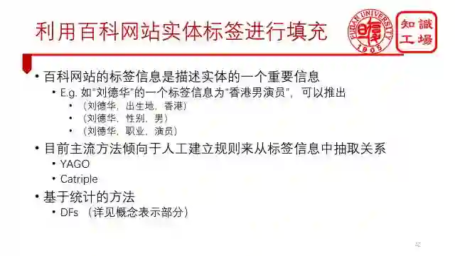 第二类方法是利用百科网站实体的标签进行填充。例如已知“刘德华”的一个标签信息为“香港男演员”,那么就可以推出(刘德华,出生地,香港),(刘德华,性别,男)和(刘德华,职业,演员)这三组infobox。目前主流的方法倾向于使用人工建立规则的方法来进行抽取,主要包括YAGO和Catriple。我们也提出了一种基于统计的方法,具体将在概念表示部分来进行说明。